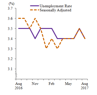 On a seasonally adjusted month-on-month basis, the unemployment rate in August 2017 was 3.4 per cent, a decrease of 0.1 percentage point compared to the previous month.