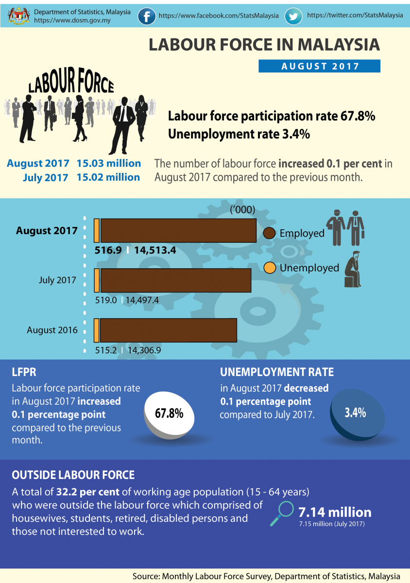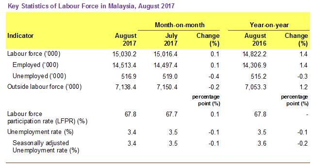 Unemployment rate for August 2017 was 3.4 per cent, dropped 0.1 percentage point compared to the previous month. Meanwhile, year-on-year unemployment rate was 0.1 percentage point lower than August 2016.
