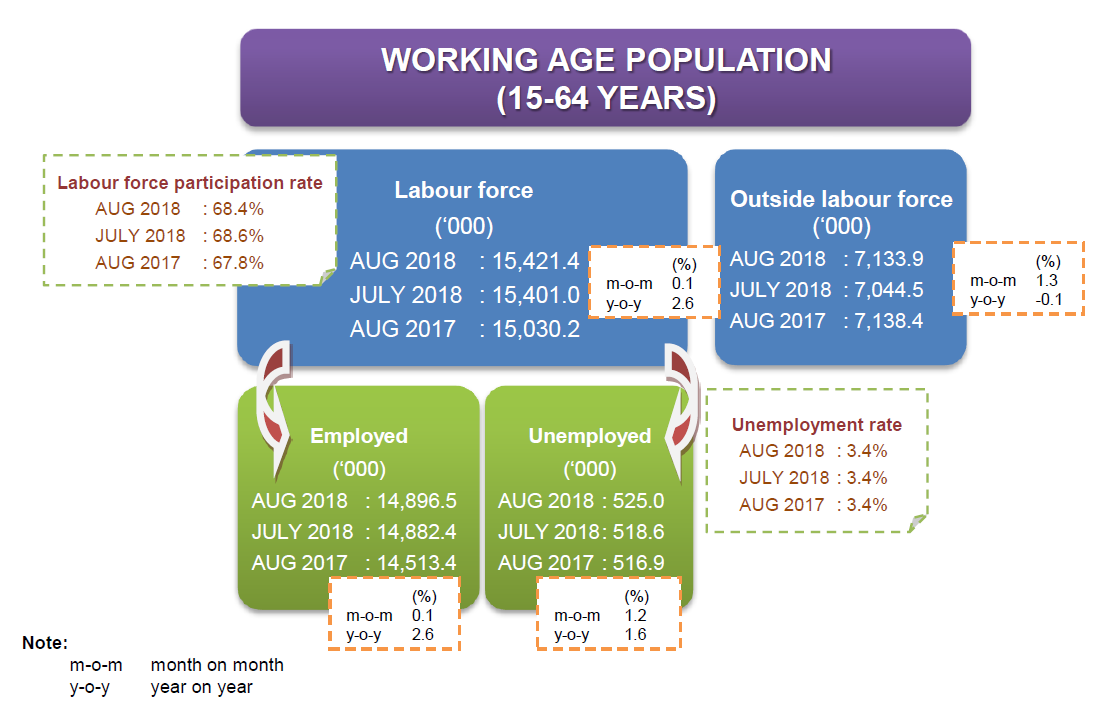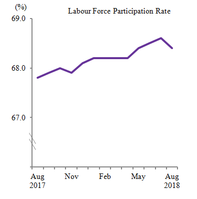The labour force participation rate in August 2018 dropped 0.2 percentage points to 68.4 per cent as compared to the previous month. On year-on-year basis, labour force participation rate increased 0.6 percentage points (August 2017: 67.8%).