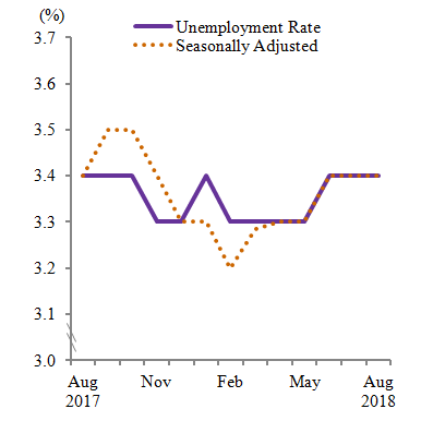 Unemployment rate (seasonally adjusted) in August 2018 remained at 3.4 per cent as compared to the previous month.