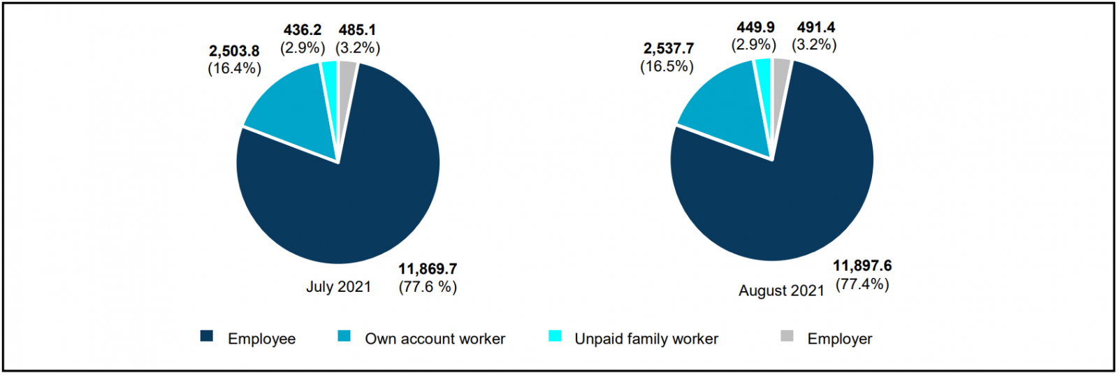 - In August 2021, employee’s category which comprised of 77.4 per cent, increased by 27.9 thousand persons to 11.90 million persons after posted a decline for the past two months. Likewise, own-account workers which consist mostly of daily income earners working as small business operators such as small retailers; hawkers; sellers in markets and stalls; as well as smallholders continued to rise since February 2021 with a month-on-month increase of 1.4 per cent or 33.9 thousand persons to record 2.54 million persons.