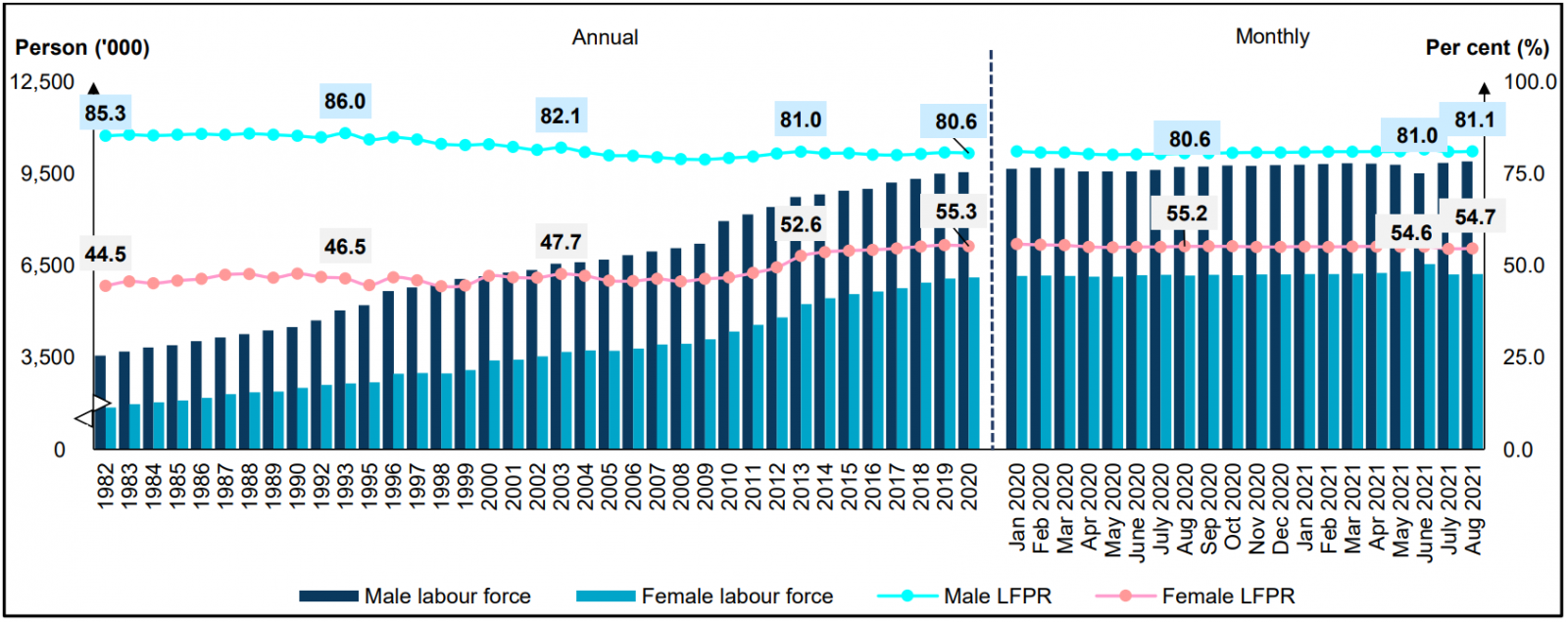Chart 7: Labour force and LFPR by sex, 1982 - 2020 and January 2020 - August 2021
