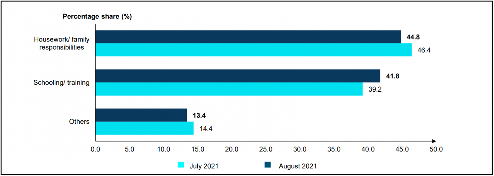 During the month, the number of outside labour force lessened by 0.4 per cent or 26.9 thousand persons to 7.45 million persons (July 2021: 7.48 million persons). On the contrary, the number of outside labour force was higher by 97.0 thousand persons (1.3%) as against the same month of the preceding year. The largest component of outside labour force was housework/ family responsibilities which comprised of 44.8 per cent and tailed by schooling/ training category with 41.8 per cent. [Chart 8]