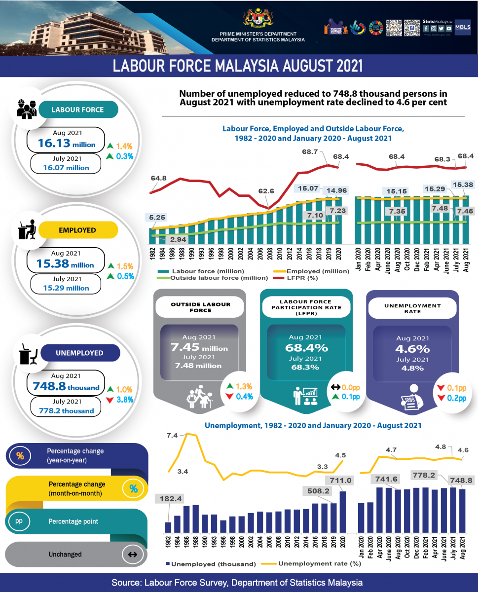 - The unemployment rate in August 2021 was downed by 0.2 percentage points to 4.6 per cent as compared to July which recorded 4.8 per cent. Accordingly, the number of unemployed persons reduced by 3.8 per cent month-on-month or equivalent to 29.4 thousand persons to register 748.8 thousand persons (July 2021: +1.2%; 778.2 thousand persons). This was the first decline in the unemployment after registering increases in June and July 2021.