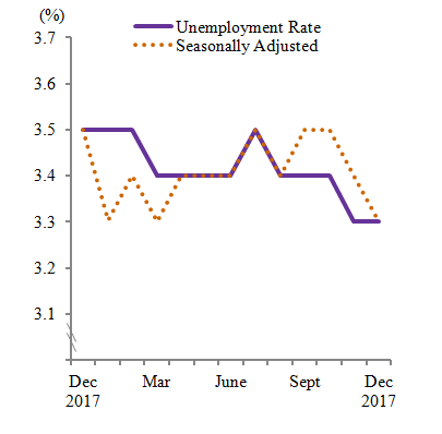 Unemployment rate for December 2017 remained at 3.3 per cent. Meanwhile year on-year comparison, unemployment rate was 0.2 percentage points lower than December 2016.