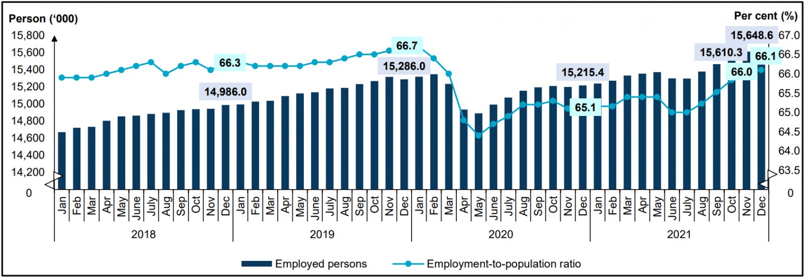 - In December 2021, employed persons remained upward, with a marginal increase of 0.2 per cent month-on-month or equivalent to 38.3 thousand persons to 15.65 million persons (November 2021: 15.61 million persons). The employment-to-population ratio which indicates the ability of an economy to create employment recorded a slight increase to 66.1 per cent during the month (November 2021: 66.0%).
