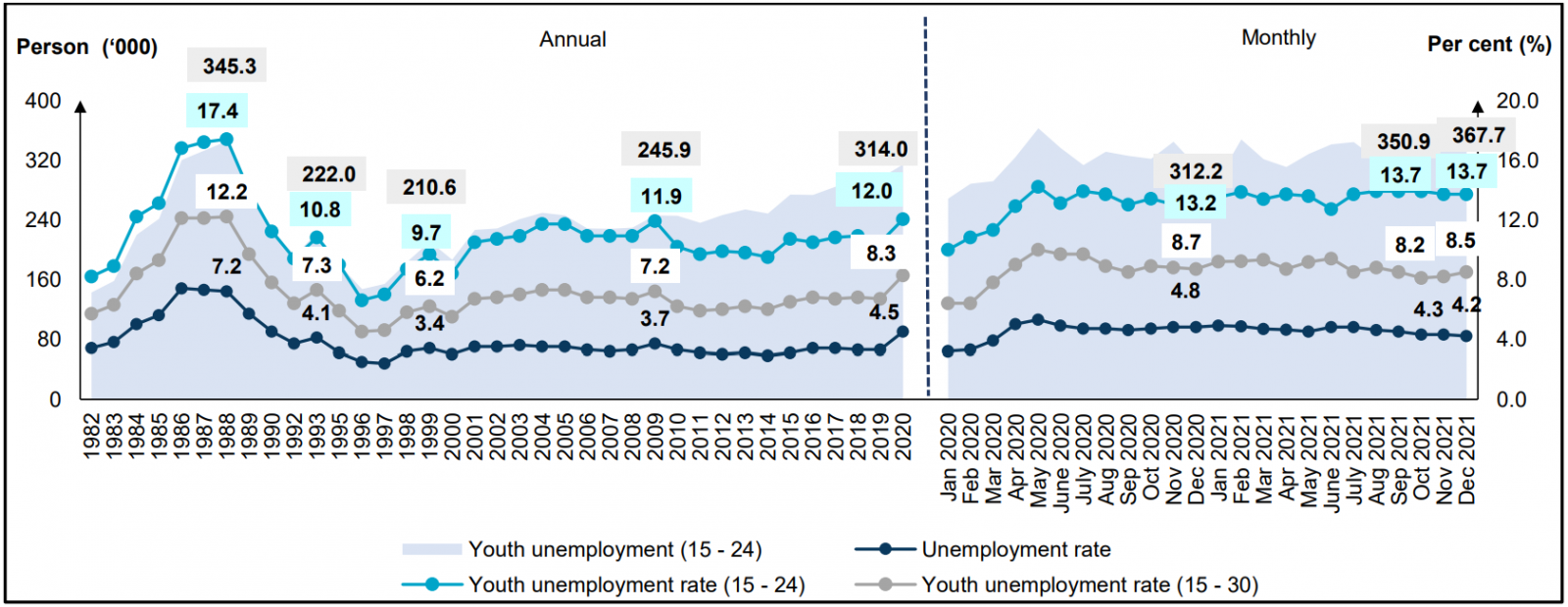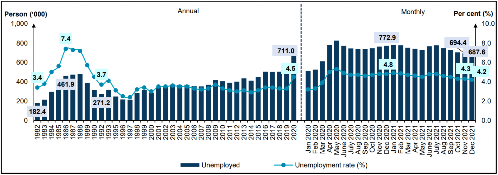 Chart 3: Unemployed persons and unemployment rate, 1982 - 2020 and January 2020 - December 2021