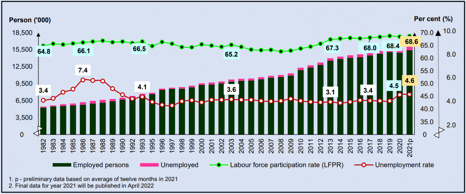 Apart from this, the battle against the pandemic prolonged into the year 2021. Thus as labour market remains in a challenging situation, the number of unemployed persons continued to increase for the second year to 741.4 thousand persons (2020: 711.0 thousand persons). Therefore, the unemployment rate climbed to 4.6 per cent in 2021 as compared to 4.5 per cent in 2020, the highest unemployment rate since year 1993 (4.1%). [Chart 9]
