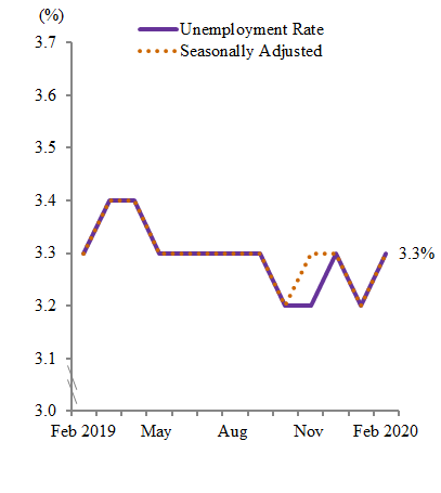 Unemployment rate (seasonally adjusted) in February 2020 also increased to 3.3 per cent as compared to 3.2 per cent in the previous month.