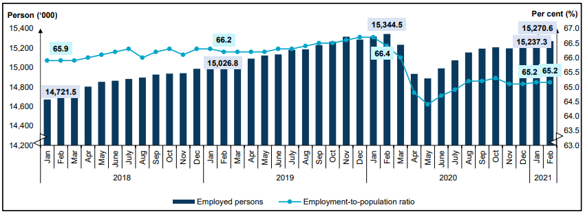 - February 2021 saw the number of employed persons rose by 0.2 per cent or equivalent to 33.3 thousand persons to 15.27 million persons (January 2021: 15.24 million persons). The employment-to-population ratio which indicates the ability of an economy to create employment remained stagnant at 65.2 per cent in February 2021.