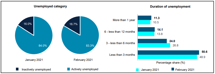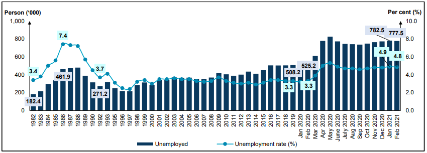 - The unemployment rate dropped 0.1 percentage point to 4.8 per cent in February 2021 as opposed to January 2021. The number of unemployed persons declined by 5.0 thousand persons or 0.6 per cent to record 777.5 thousand persons (January 2021: 782.5 thousand persons).