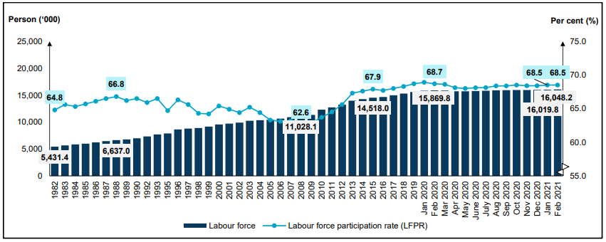 - During the month, the number of labour force increased by 0.2 per cent or 28.4 thousand persons to 16.05 million persons (January 2021: 16.02 million persons). The labour force participation rate (LFPR) for the month was unchanged at 68.5 per cent.