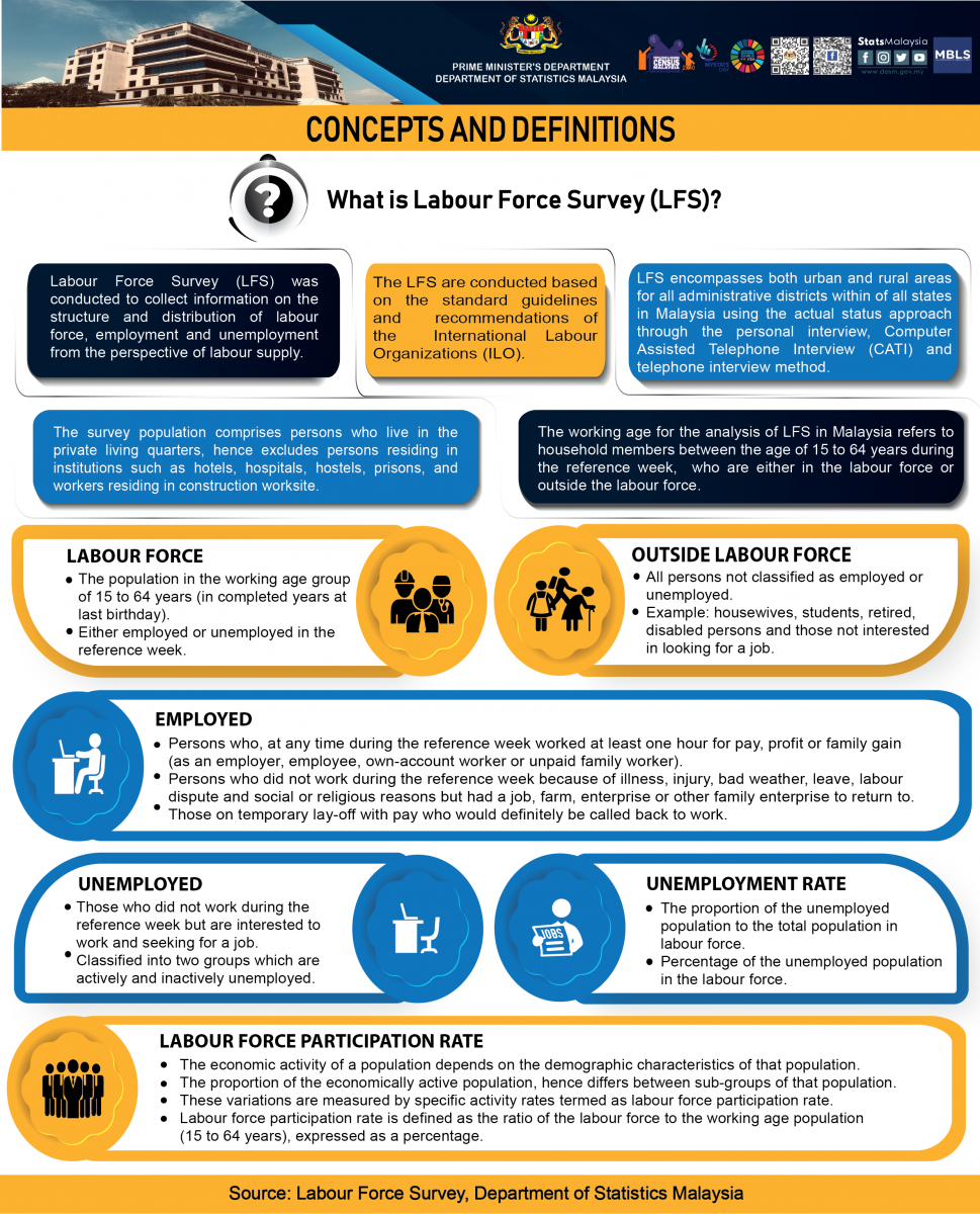 Starting with the monthly release of the Principal Statistics of Labour Force, Malaysia, January 2016, the principal statistics of labour is estimated based on the current population estimates as compared to the previous series which used population projections based on the Population and Housing Census of Malaysia, 2010. This rebase is to obtain statistics that is more consistent with current population structure.