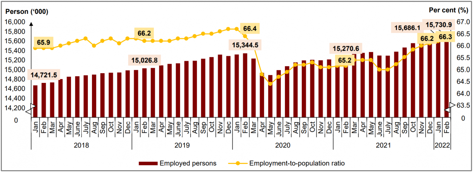 The continuous improvement in employed persons remained in February 2022 with a month-on-month increase of 0.3 per cent (+44.8 thousand people) to post 15.73 million persons (January 2022: 15.69 million persons). As for the year-on-year comparison, the number of employed persons rose by 3.0 per cent or with an addition of 460.3 thousand persons (February 2021: 15.27 million persons).