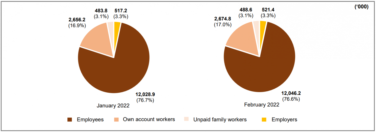 - In February 2022, the employee’s category which had consistently made up the largest composition of employed persons, comprised a share of 76.6 per cent, registering a month-on-month rise of 0.1 per cent (+17.3 thousand persons) to 12.05 million persons (January 2022: 12.03 million persons). Similar trend was observed in the own-account workers category which remained increasing with an addition of 0.7 per cent (+18.6 thousand persons) to register 2.67 million persons (January 2022: 2.66 million persons).