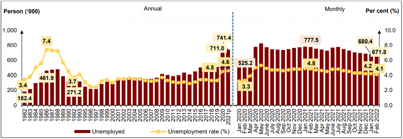 Chart 3: Unemployed persons and unemployment rate, 1982 - 2021p and January 2020 - February 2022