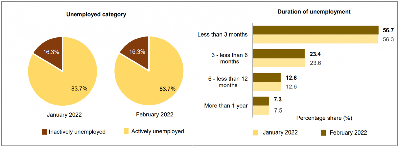 - In February 2022, the number of unemployed persons continued to fall by 1.3 per cent (-8.6 thousand persons) to record 671.8 thousand persons as against January 2022 (680.4 thousand persons). Accordingly, February’s unemployment rate edged down to 4.1 per cent (January 2022: 4.2 per cent).