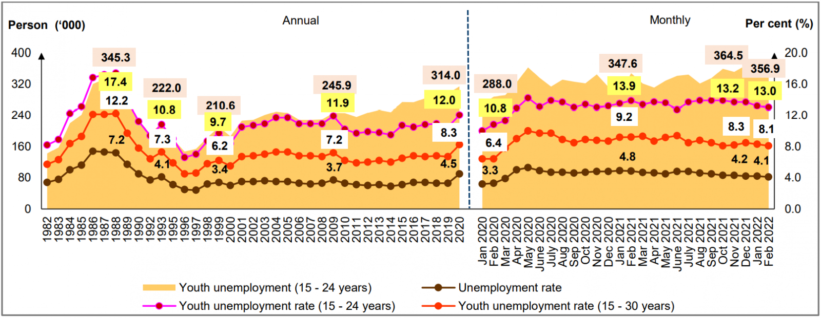 In February 2022, the unemployment rate for youth aged 15 to 24 years posted a decrease of 0.2 percentage points to 13.0 per cent with the number of unemployed youths lessened by 7.5 thousand persons or 2.1 per cent to record 356.9 thousand persons (January 2022: 364.5 thousand persons). Likewise, the unemployment rate for youth aged 15 to 30 years diminished by 0.2 percentage points to 8.1 per cent, registering lower number of unemployed persons at 513.7 thousand persons (January 2022: 8.3%; 521.8 thousand persons). [Chart 5]
