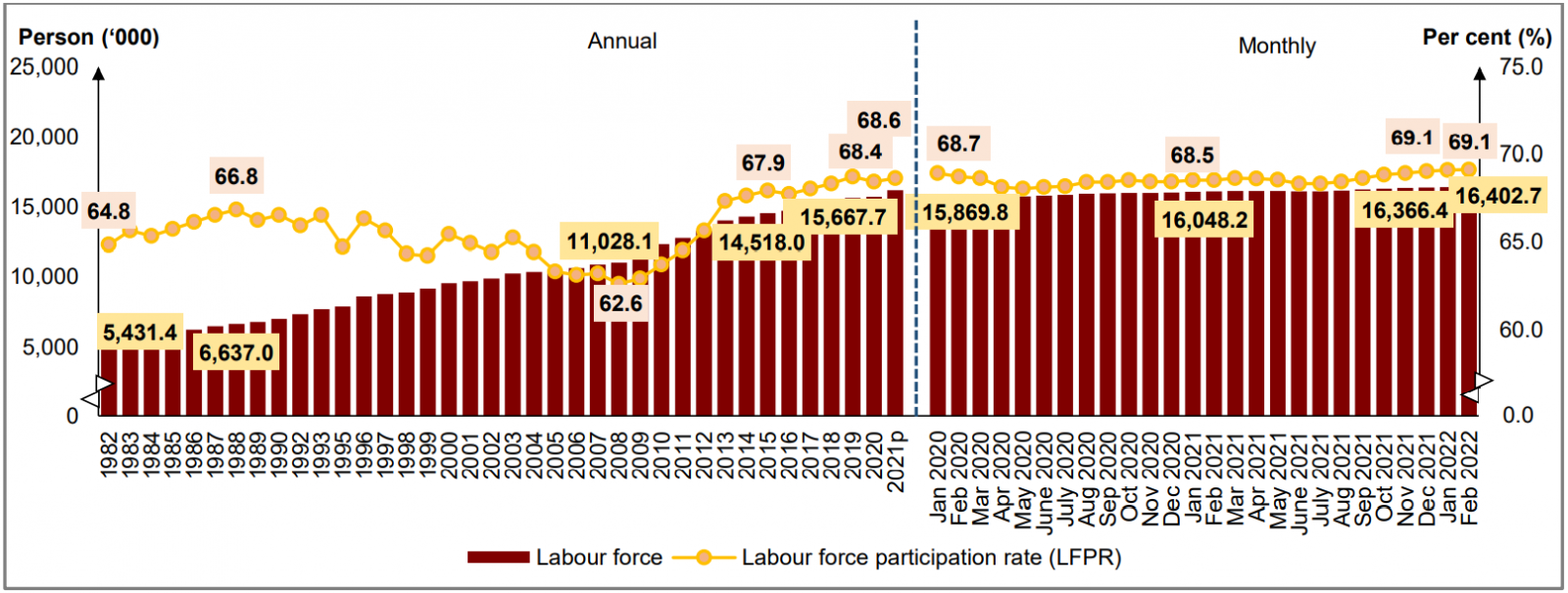 In February 2022, the number of labour force continued to register month-on-month increase, rising by 0.2 per cent (+36.3 thousand persons) to 16.40 million persons (January 2022: 16.37 million persons). The labour force participation rate (LFPR) remained unchanged at 69.1 per cent.