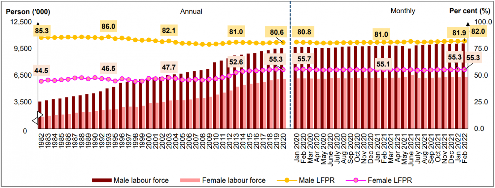Chart 7: Labour force and LFPR by sex, 1982 - 2020 and January 2020 - February 2022