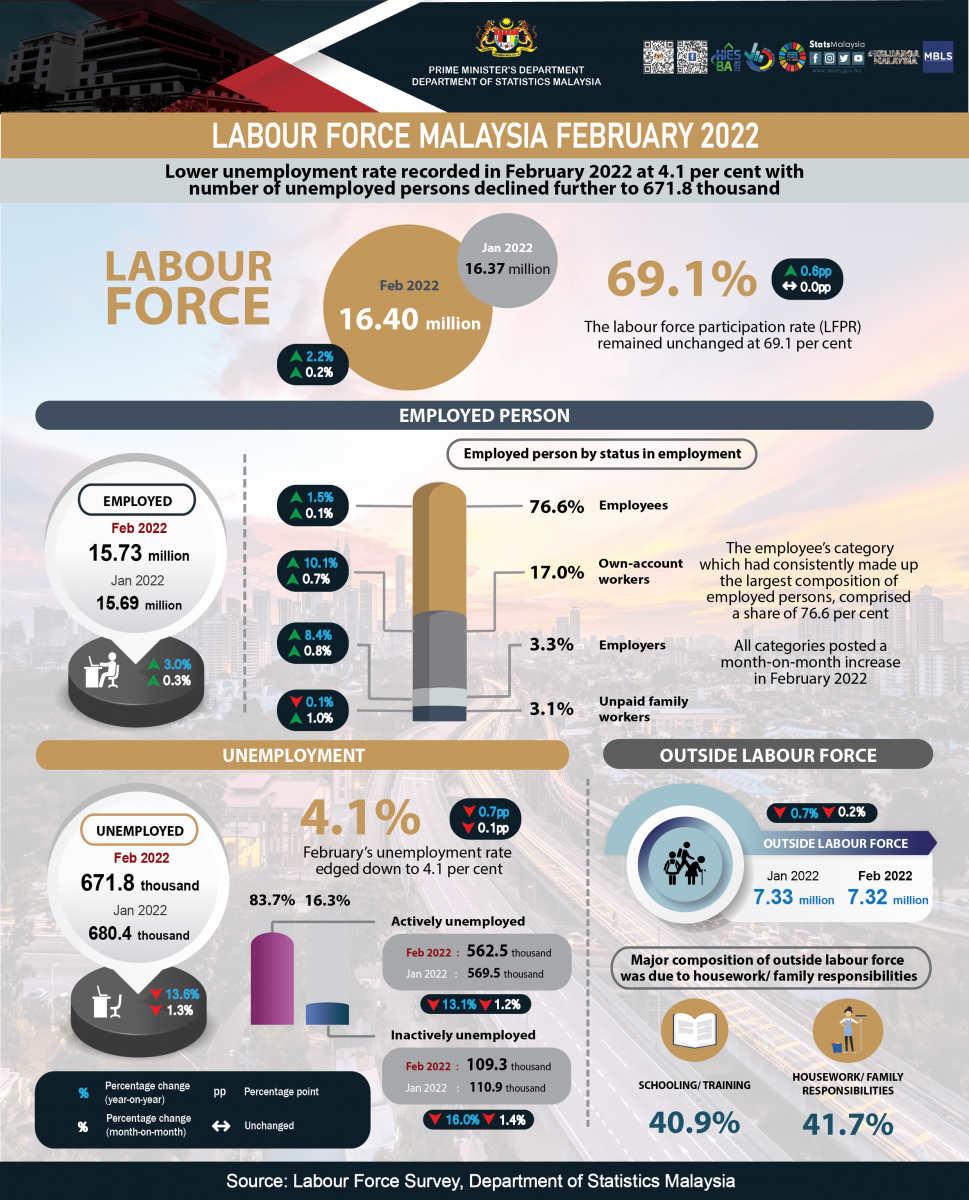 - In February 2022, the number of labour force continued to register month-on-month increase, rising by 0.2 per cent (+36.3 thousand persons) to 16.40 million persons (January 2022: 16.37 million persons). The labour force participation rate (LFPR) remained unchanged at 69.1 per cent.