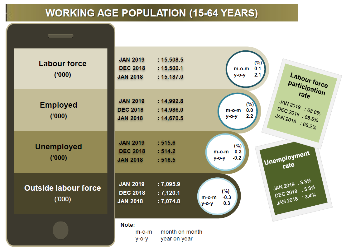 The unemployment rate in January 2019 remained at 3.3 per cent since September 2018. The number of unemployed persons recorded a total of 515.6 thousand persons, dropped 0.2 per cent against January 2018.