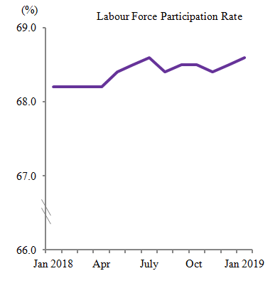 The labour force participation rate in January 2019 increased 0.1 percentage point to 68.6 per cent as compared to the previous month and increased 0.4 percentage points as compared to the same month of previous year (January 2018: 68.2%).