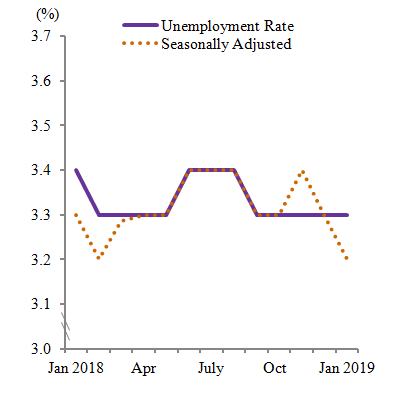 Unemployment rate (seasonally adjusted) in January 2019 decreased to 3.2 per cent as compared to 3.3 per cent in the previous month.