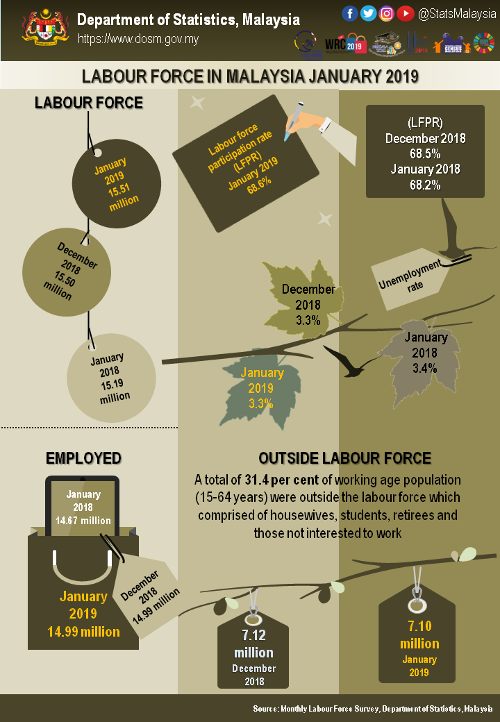 Starting with the monthly release of the Principal Statistics of Labour Force, Malaysia, January 2016, the principal statistics of labour is estimated based on the current population estimates as compared to the previous series which used population projections based on the Population and Housing Census of Malaysia, 2010. This rebase is to obtain statistics that is more consistent with current population structure.