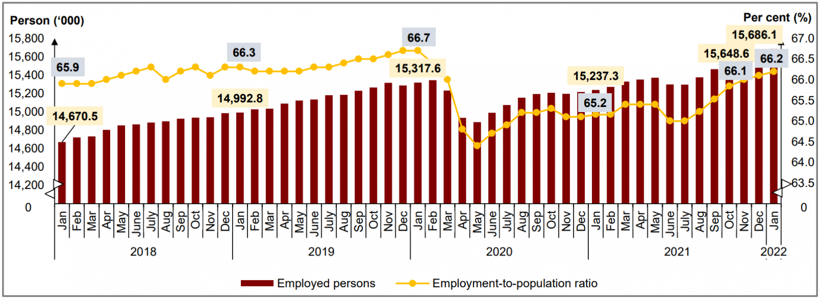 LABOUR FORCE SITUATION CONTINUED TO IMPROVE IN JANUARY 2022 LED BY THE RISE IN EMPLOYMENT WHILE UNEMPLOYED PERSONS TRENDED DOWN