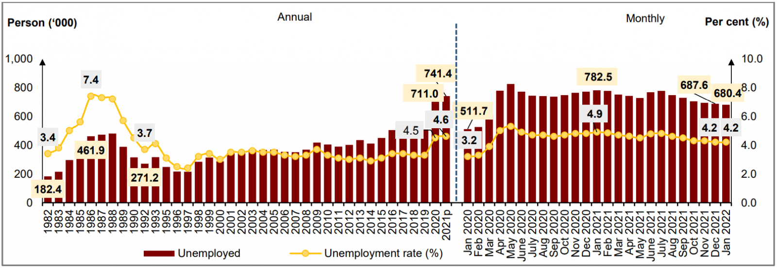 Chart 3: Unemployed persons and unemployment rate, 1982 - 2021p and January 2020 - January 2022