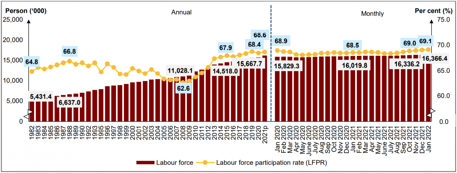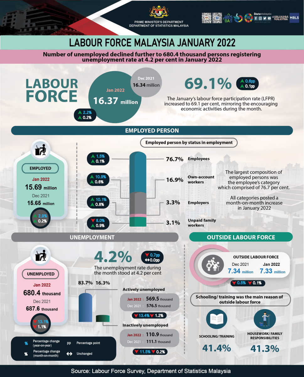 The number of labour force in January 2022 remained positive with an addition of 30.2 thousand persons or 0.2 per cent month-on-month to register 16.37 million persons (December 2021: 16.34 million persons). Therefore, the January’s labour force participation rate (LFPR) increased to 69.1 per cent (December 2021: 69.0%).