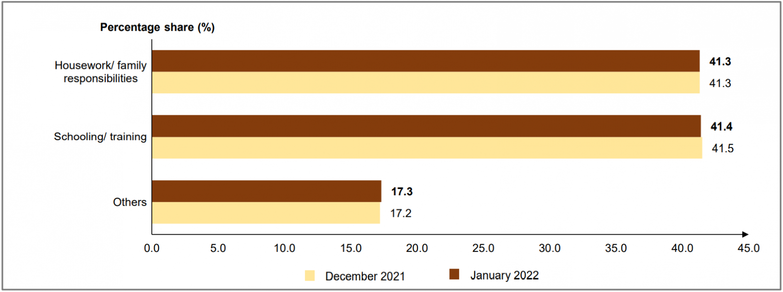 The number of outside labour force in January 2022 reduced further to 7.33 million persons with a lessening of 5.6 thousand persons or 0.1 per cent (December 2021: 7.34 million persons). Likewise, year-on-year, the number of outside labour force declined by 34.1 thousand persons (0.5%) as compared to the January 2021 (7.37 million persons). Schooling/ training was the main reason of outside labour force with a share of 41.4 per cent, followed by housework/ family responsibilities category (41.3%). [Chart 8]