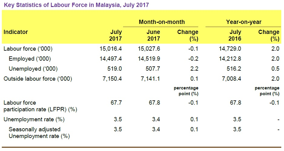 Unemployment rate for July 2017 was 3.5 per cent, an increase of 0.1 percentage point compared to the previous month. Meanwhile, year-on-year comparison, the rate did not record any change.
