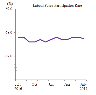 Labour force participation rate in July 2017 was 67.7 per cent, fell 0.1 percentage point compared to the previous month.