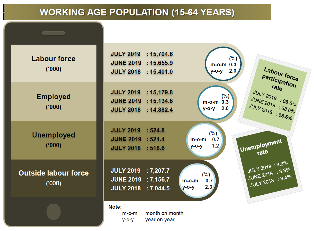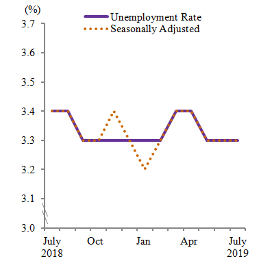 Unemployment rate (seasonally adjusted) in July 2019 also remained at 3.3 per cent.