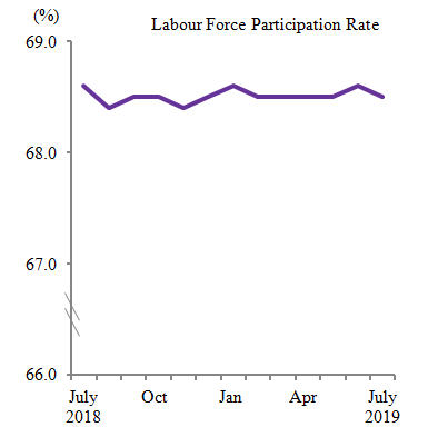 The labour force participation rate in July 2019 decreased 0.1 percentage point to 68.5 per cent as compared to the previous month. Similarly, year-on-year labour force participation rate decreased 0.1 percentage point (July 2018: 68.6%).