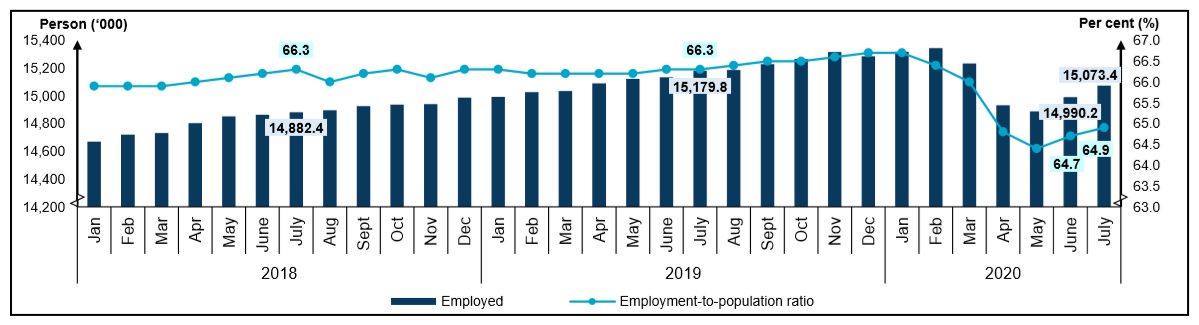 The employment-to-population ratio increased to 64.9 per cent in July 2020 from 64.7 per cent in the previous month, indicating the ability of an economy to create employment. Year-on-year, the employment-to-population ratio dropped 1.3 percentage points from 66.3 per cent in July 2019. [Chart 1]