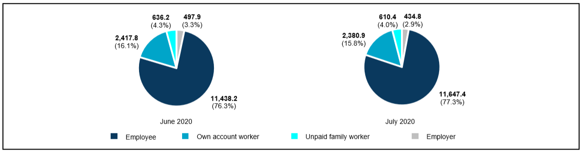 In July 2020, the number of employed persons continued to grow by 0.6 per cent month-on-month after recording a growth of 0.7 per cent in June 2020. After three consecutive months registering employed persons below 15 million, the number went up to 15.07 million persons. On the contrary, employed persons declined by 0.7 per cent year-on-year as against July 2019.