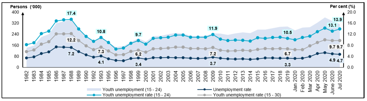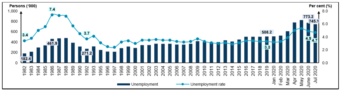 Chart 3: Unemployed persons and unemployment rate, 1982 - 2019 and January - July 2020