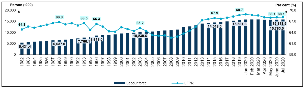 As the permission to operate extended to more sectors including tourism, education, entertainment & recreational activities, the total labour force increased by 55.0 thousand persons to 15.82 million persons compared to June 2020. The labour force participation rate (LFPR) in July 2020 remained at 68.1 per cent.