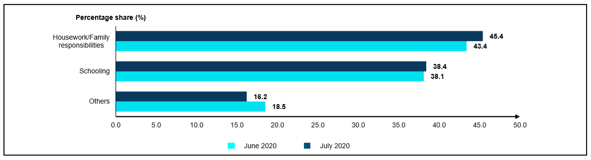 In July 2020, outside labour force increased slightly by 0.02 per cent (+1.3 thousand persons) to 7.40 million persons while year-on-year rose 2.7 per cent (+192.1 thousand persons). The largest share of outside labour force was due to housework/ family responsibility with 45.4 per cent, followed by schooling with a share of 38.4 per cent. [Chart 8]