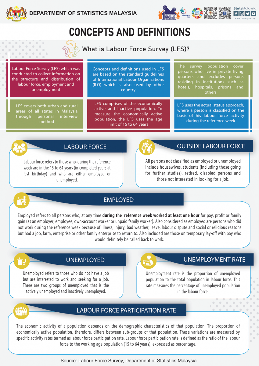 Starting with the monthly release of the Principal Statistics of Labour Force, Malaysia, January 2016, the principal statistics of labour is estimated based on the current population estimates as compared to the previous series which used population projections based on the Population and Housing Census of Malaysia, 2010. This rebase is to obtain statistics that is more consistent with current population structure.