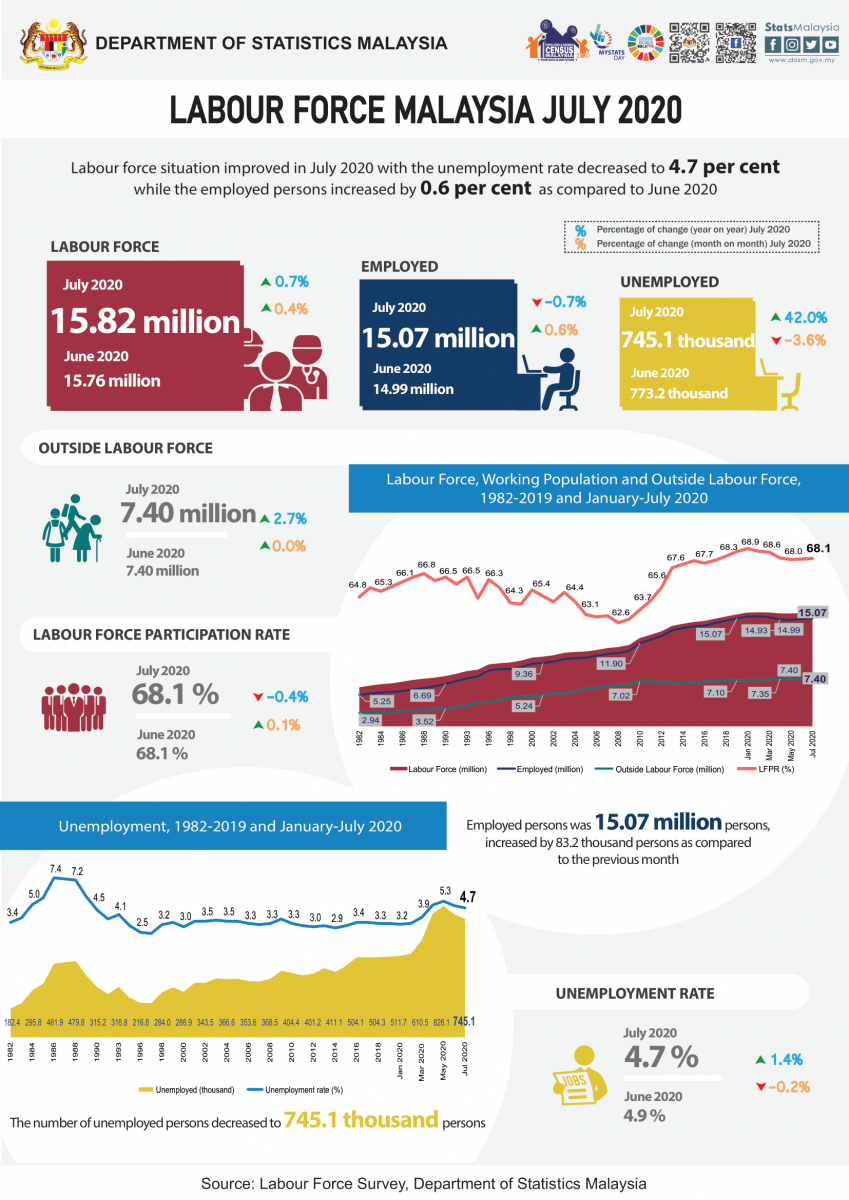 Unemployment rate continued to fall in July 2020 to 4.7 per cent after recording 4.9 per cent in June 2020. The number of unemployed persons fell by 28.2 thousand to 745.1 thousand persons.