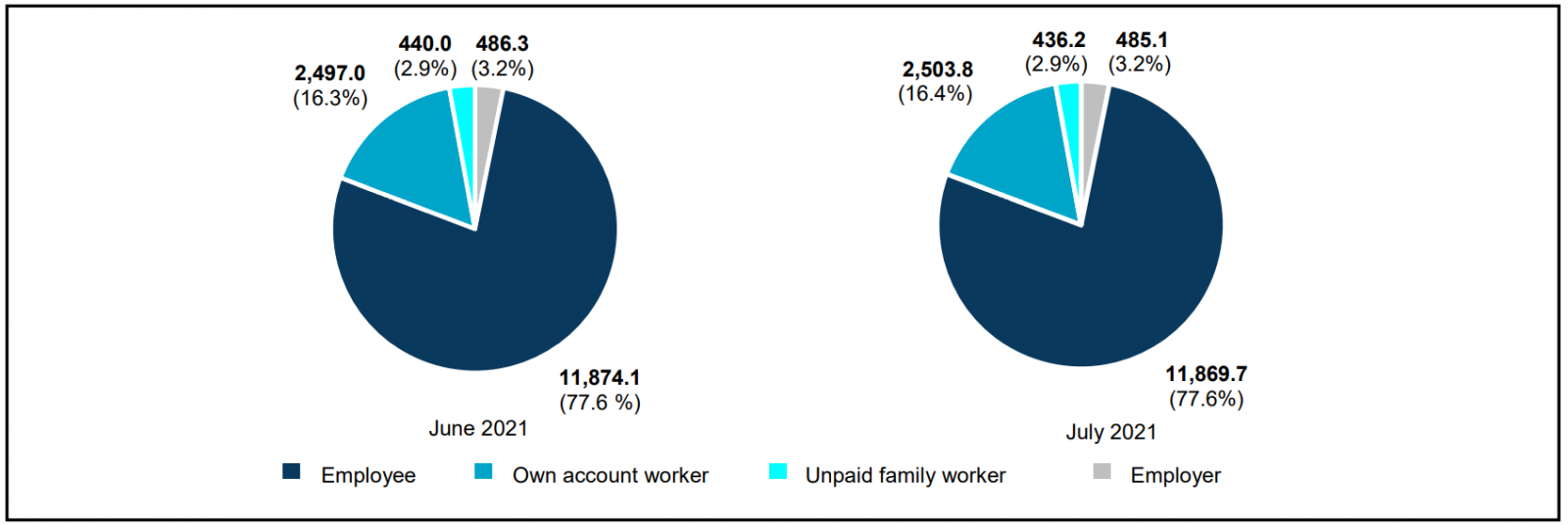 - The employee’s category which accounted for 77.6 per cent of total employed persons, reduced by 4.4 thousand persons to record 11.87 million persons in July 2021. Nevertheless, own-account workers continued to post a positive change for six consecutive months with an addition of 6.8 thousand persons (0.3%) to 2.50 million persons in July 2021.