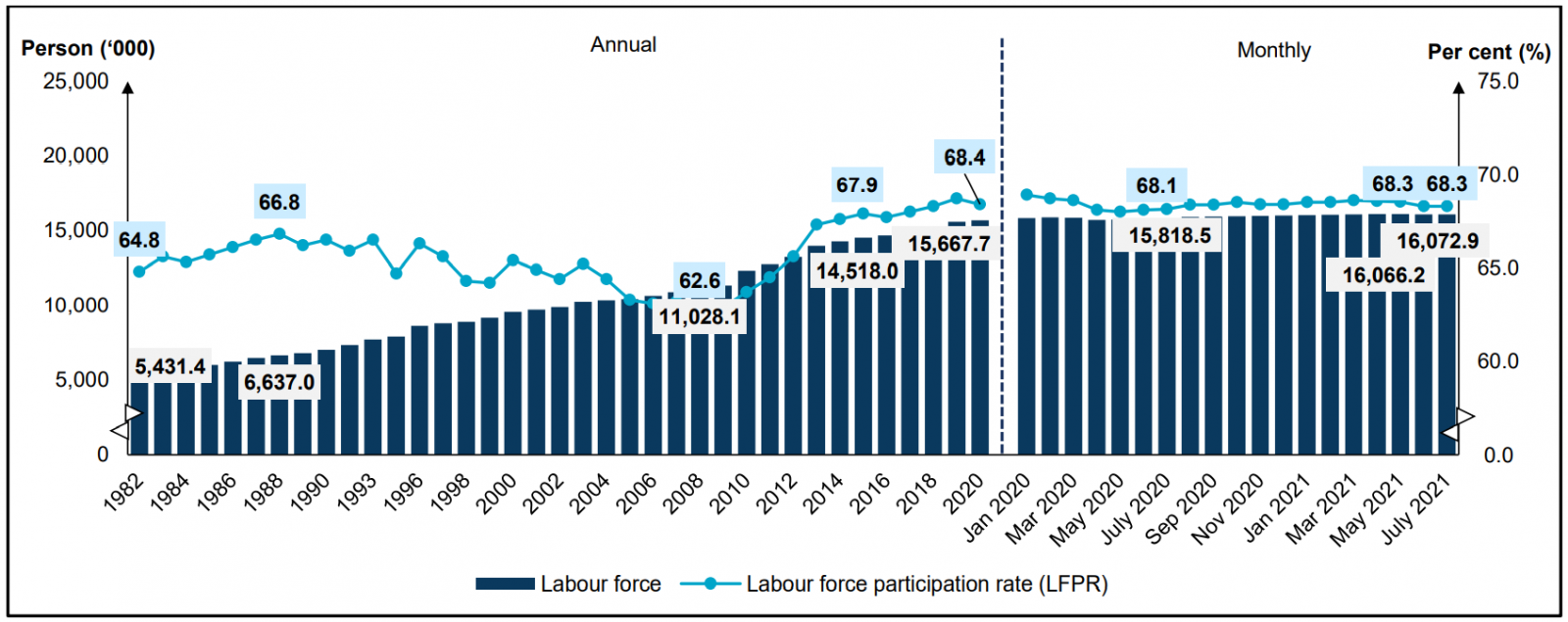 Chart 6: Labour force and LFPR, 1982 – 2020 and January 2020 - July 2021