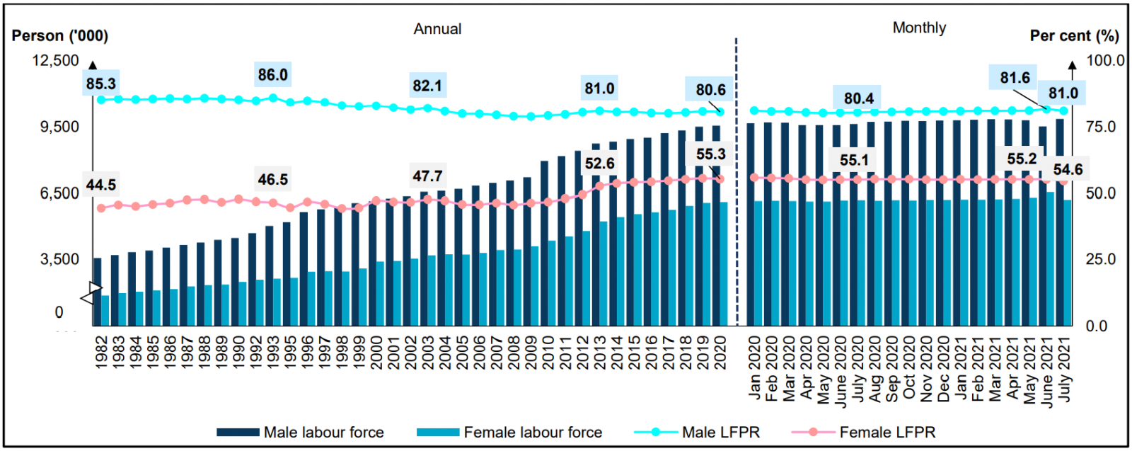 Chart 7: Labour force and LFPR by sex, 1982 - 2020 and January 2020 - July 2021