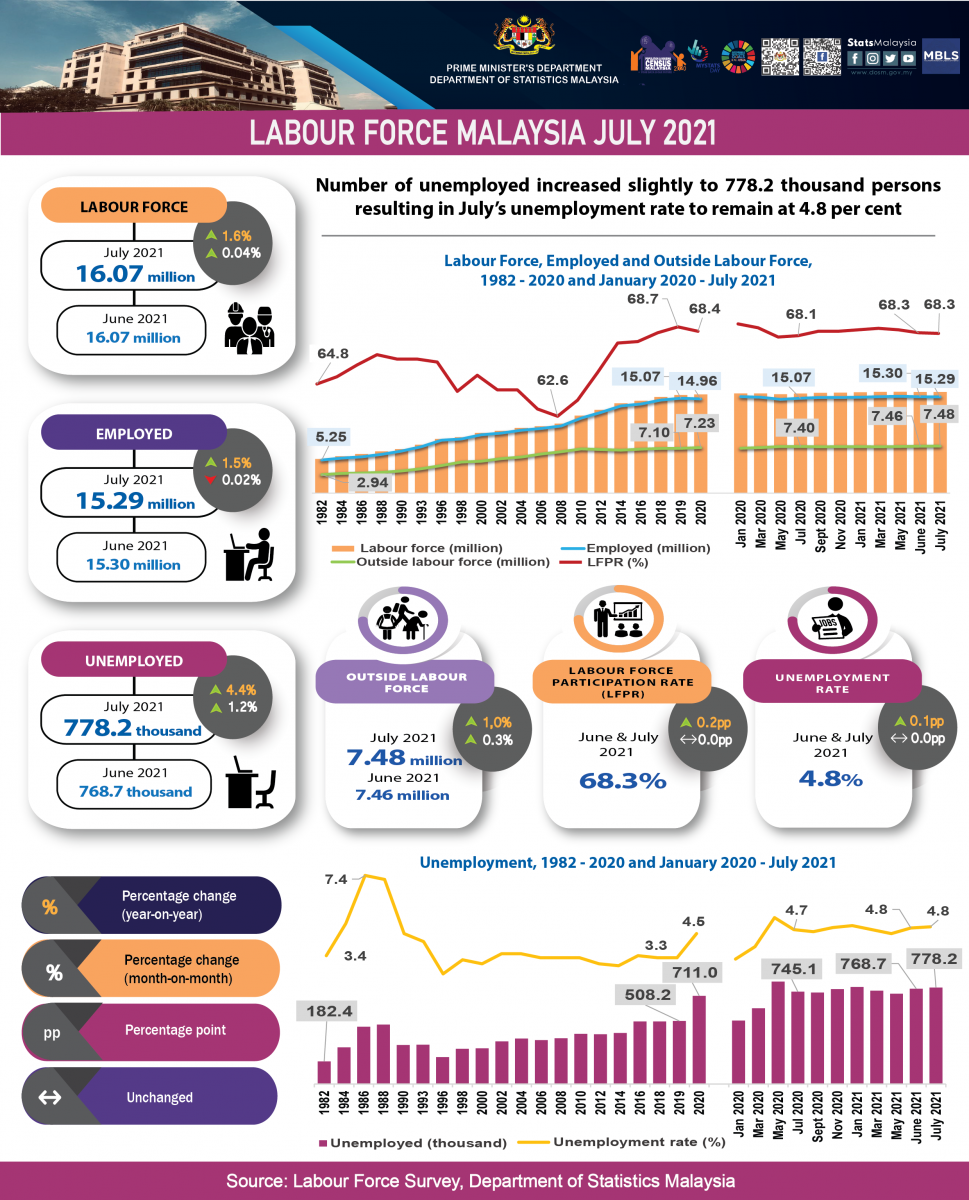 - In July 2021, the unemployment rate remained unchanged at 4.8 per cent after registering a positive month-on-month change in the previous month. The number of unemployed persons increased further albeit at a slower rate by 1.2 per cent (9.5 thousand persons) to record 778.2 thousand persons (June 2021: 5.6%; 768.7 thousand persons).