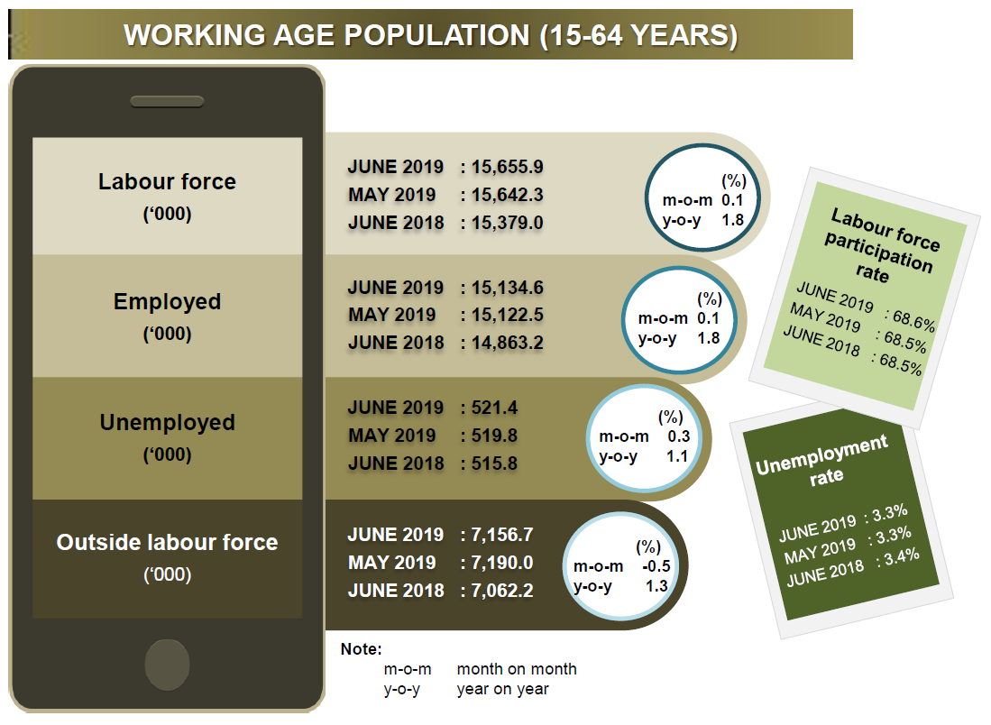Unemployment rate (seasonally adjusted) in June 2019 also remained at 3.3 per cent.
