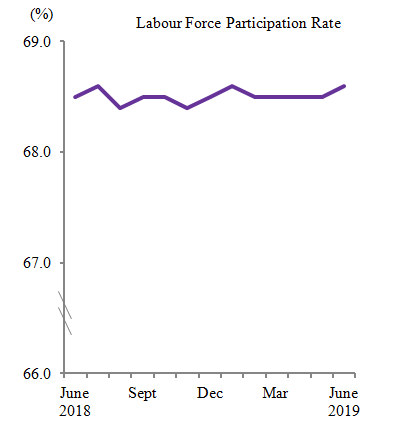 The labour force participation rate in June 2019 increased 0.1 percentage point to 68.6 per cent as compared to the previous month and increased 0.1 percentage point as compared to the same month of previous year (June 2018: 68.5%).